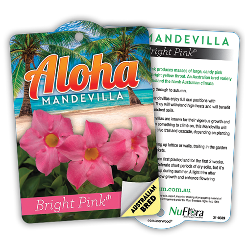 Aloha Bright Pink produces masses of large, candy pink flowers wih a bright yellow throat. An Australian bred variety designed to withstand the harsh Australian climate. Mandevillas are known for their vigorous growth and climbing habit. Given something to climb on, this Mandevilla will take any shape. Can also trail and cascade, depending on planting arrangement.