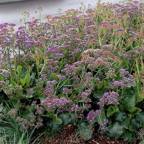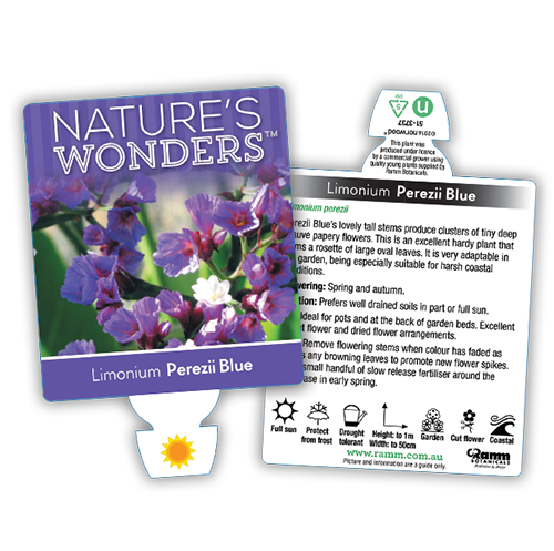 Perezii Blue is a compact, hardy, proven performer that is an impeccable choice for the low maintenance garden. Perezii Blue bears clusters of tiny, purple and white, papery flowers which are perfect for use as a cut flower, as they appear on long, strong stems. Flowers appear similar to a canopy over the large, slightly leathery leaves. Limonium will tolerate salty soil and winds, in fact, it works so well in these areas we’re certain you’ve seen it somewhere around the beach before.