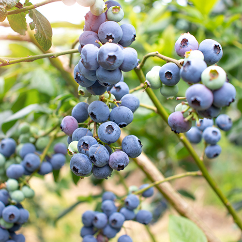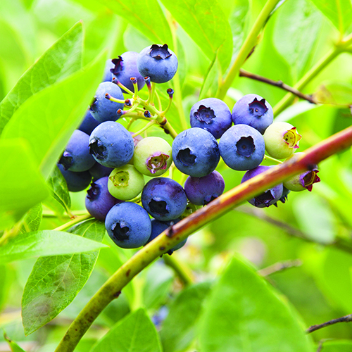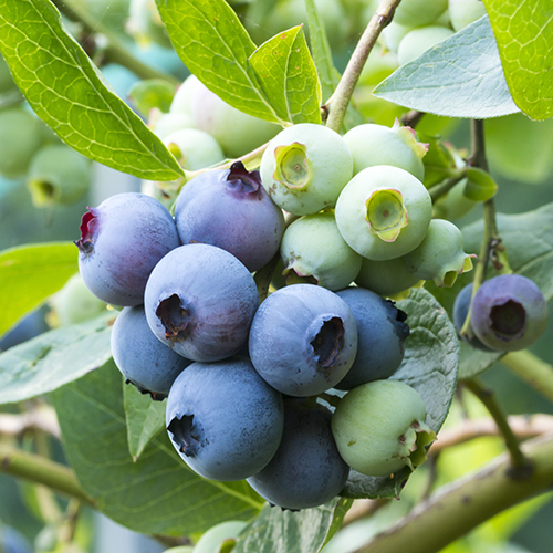 Edible and ornamental, Sunshine Blue is a compact rounded deciduous shrub with small, silvery green leaves that turn attractive shades of red and purple in autumn. In late spring, masses of pink flowers give way to multitudes of medium, sweet, dark blue berries. Sunshine Blue is an easy growing blueberry option as it has low chill requirements of only 150 hours and can tolerate acidic soils. Although self-fertile, cross-pollination helps to produce larger berries and larger yields.